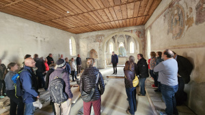 Auch dieses Jahr hatten wir uns entschlossen, die Anreise mit dem eigenen PKW anzutreten, da sich dadurch eine flexible Gestaltung des Tages ergab und im Anschluss die Möglichkeit bestand, sich noch individuell dem gemütlichen Ausklang in Fließ anzuschließen. Pünktlich um 8:50 Uhr trafen wir uns am Parkplatz beim Dorfeingang in Serfaus und nutzen die Dorfbahn Serfaus – die kleinste Luftkissen-U-Bahn der Welt – für eine kurze Fahrt zur Wallfahrtskirche. Die Kirche zählt zu den bedeutendsten Marienwallfahrtsorten Tirols und geht in ihren Ursprüngen auf das Mittelalter zurück. Ein besonderes Thema der Führung waren die zur Zeit laufenden Restaurierungen der Fresken sowie die archäologischen Bodengrabungen, die im Rahmen der Komplettsanierung der Kirche 2024/2025 durchgeführt werden.