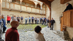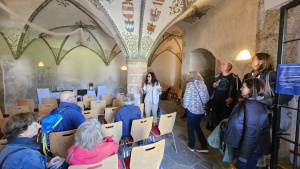 Nach einem gemeinsamen Mittagessen im Gasthof Falkeis in Kauns ging es gestärkt weiter zur Besichtigung von Schloss Berneck. Die malerisch auf einem Felssporn gelegene Burg zählt zu den markantesten Baudenkmälern des Tiroler Oberlandes. Ihre Ursprünge reichen ebenfalls ins Hochmittelalter zurück. Im Laufe der Geschichte war Schloss Berneck Sitz verschiedener Adelsgeschlechter und erlebte Zeiten des Verfalls wie auch der Restaurierung. Heute befindet sich die Anlage in Privatbesitz. Eigentümer Dipl.-Ing. Dr. Richard Hörmann führte persönlich durch die historischen Räume und erläuterte anschaulich die Baugeschichte, Restaurierungsmaßnahmen und die besondere Lage der Burg über dem Kaunertal.