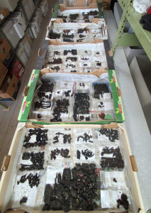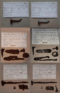 In einem ersten Schritt wurde mit den Eisenfunden der Ausgrabung „Mustergasse“ aus dem Jahr 1996 begonnen. Hierfür wurden zunächst acht Kartons mit insgesamt über 200 Schraubgläsern sowie drei große Kunststoffbehälter mit in destilliertem Wasser eingelegten Eisenfunden vorsichtig ausgepackt, aufgelegt und getrocknet.