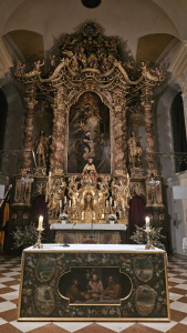 Um 16 Uhr brachte uns das Schiff wieder zurück nach Prien, von wo aus wir unsere Reise mit dem Bus fortsetzten und nach Rohrdorf weiterfuhren. Dort kehrten wir zunächst für ein gemeinsames Abendessen im Hotel zur Post ein. Anschließend stand noch ein besonderer Programmpunkt auf dem Programm: die Besichtigung des Hochaltars in der Pfarrkirche St. Jakobus der Ältere. Da an diesem Wochenende in Rohrdorf die Feierlichkeiten zum 200-jährigen Weihejubiläum der Pfarrkirche St. Jakobus der Ältere stattfanden, hatten wir die Gelegenheit, an einer besonderen Nachtführung durch die Kirche teilzunehmen. In stimmungsvoller Atmosphäre erhielten wir Einblicke in die Geschichte und die kunsthistorischen Besonderheiten des Gotteshauses. Der barocke Hochaltar wurde im Jahr 1712 vom Bildhauer und Altarbauer Franz Jakob Amrhein ursprünglich für die Damenstiftskirche in Hall in Tirol geschaffen. Nachdem das Damenstift im Zuge der kirchlichen Reformen und der Säkularisation unter Kaiser Joseph II. aufgelöst worden war, wurde der Altar nach Rohrdorf verkauft und fand dort in der Pfarrkirche St. Jakobus der Ältere eine neue Aufstellung. Der kunstvoll gestaltete Altar mit seinen Figuren, Säulen und reichen Verzierungen zählt zu den bedeutenden barocken Ausstattungsstücken der Kirche und stellt zugleich eine interessante Verbindung zur Geschichte der Stadt Hall dar.