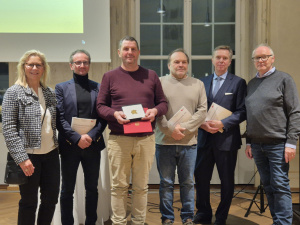Verleihung Denkmalschutzmedaille 2025, v.l.n.r: Gabriele Neumann (Tiroler Landeskonservatorin), Thomas Lindtner (Vereinsobmann), Klaus Karnutsch (Multimediadesigner und Entwickler Hall360 Projekt), Alexander Zanesco (wissentschaftl. Leitung, Stadthistoriker, Archäologe), Christoph Bazil (Präsident des Österr. Bundesdenkmalamtes), Walter Hauser (Vereinsvorstand, Denkmalpflege-Experte), Foto: Bundesdenkmalamt.